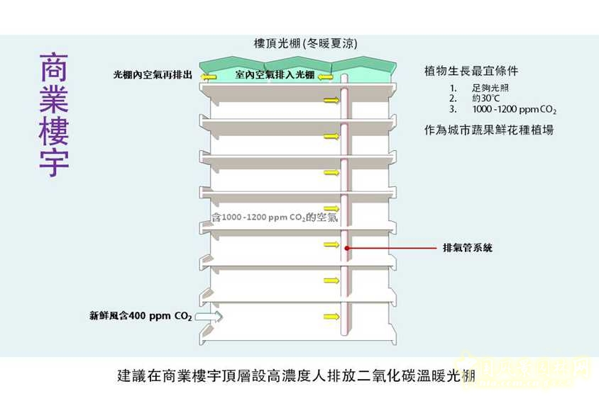 本項目所設計的屋頂溫室花園并不只是局限于考慮視覺美觀,更重要的是它所帶來生態效應,它在屋頂花園的基礎上加入了溫室的設計,室頂棚形成一個半封閉的效果,將建筑物內人員自身排放的二氧化碳導入屋頂的溫室;同時自然調節花園溫室溫度,這項屋頂溫室花園技術的發明及推廣將會在城市建筑物節能、低碳、農作物生產等方面起到極大的啟示作用。