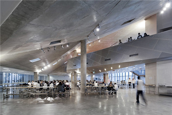 與常規的學校以教學空間為主的設計不同,設計團隊為北京四中房山校區創造了大量社交空間,尺度不一,亦考慮到了不同程度的私密性,這樣的設計鼓勵師生在整個建筑之中漫步、玩耍或是交流,教學空間被延展至戶外,部分活動也能夠被帶入室內,一方面提高了空間使用率,另一方面也讓校園內的學習生活變得更富于樂趣。