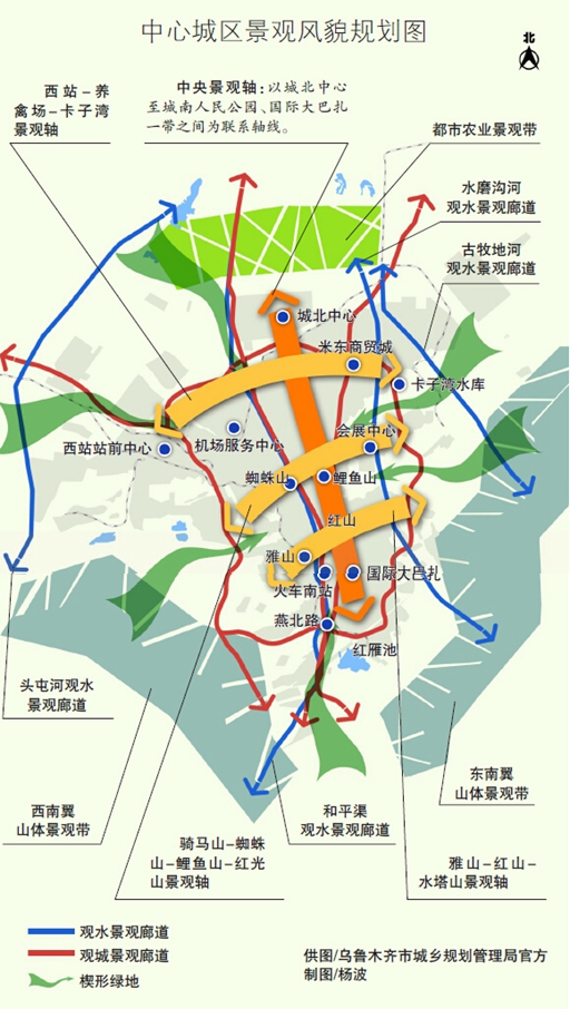 在這些規(guī)劃中,中心城區(qū)景觀風(fēng)貌規(guī)劃顯示,將來(lái)烏市景觀布局貌似蝴蝶,城區(qū)內(nèi)將以“四軸四水”形成城市景觀骨架,城區(qū)東、西、北3個(gè)方向則為西南翼山體景觀帶、東南翼山體景觀帶和都市農(nóng)業(yè)景觀帶。其中,兩個(gè)山體景觀帶主要由博格達(dá)峰、東山、西山、天格爾山等構(gòu)成,都市農(nóng)業(yè)景觀帶以城市北部基本農(nóng)田和烏魯木齊河下游濕地為基礎(chǔ),范圍大致覆蓋了米東區(qū)長(zhǎng)山子鎮(zhèn)至五一農(nóng)場(chǎng)之間的條狀區(qū)域,這3個(gè)景觀帶將形成烏魯木齊城市周邊生態(tài)涵養(yǎng)帶,通過(guò)向城區(qū)內(nèi)滲透的楔形綠帶,形成城區(qū)生態(tài)緩沖帶和通風(fēng)廊道。