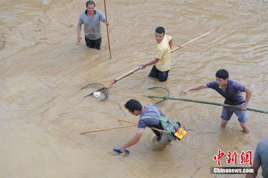 2015年5月27日,貴州省黔東南苗族侗族自治州,雷山縣26日晚間遭到暴雨襲擊并引發洪澇災害。27日,當地一些人在洪水中撈魚和浮柴。