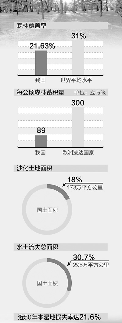 土地沙化、石漠化嚴重。我國現有沙化土地面積173萬平方公里,占國土面積的18%。水土流失比較嚴重。現在水土流失總面積295萬平方公里,占國土面積的30.7%。濕地破壞到目前為止還難以抑制,據長期研究和統計,近50年來我國的濕地損失率達到了21.6%。