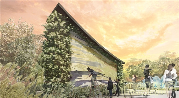 綠墻上的壁畫以及花園中的生態(tài)格網(wǎng)等均是環(huán)境藝術(shù)的體現(xiàn),通過展示當前地域及全球環(huán)境狀況以及景觀更迭,形象的藝術(shù)可以幫助人們以最愉悅的方式了解認識生態(tài)現(xiàn)代化、可再生能源以及“綠色生活”的可行性。