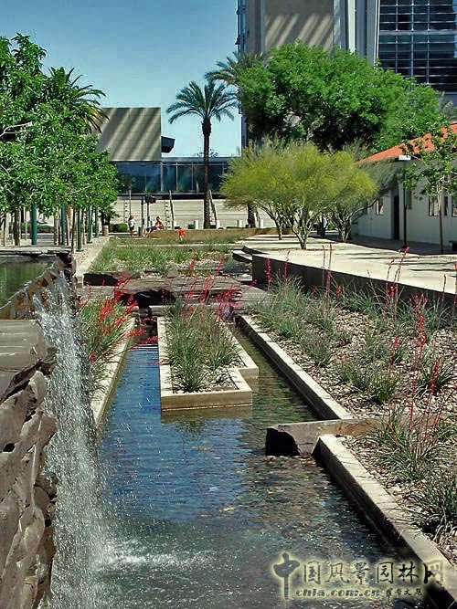 整個項目的預算只有180萬美元,在資金和環(huán)境的限制條件下,SWA集中資源,在符合當?shù)丨h(huán)境條件的同時,用樹和水設計出一個獨特的道路景觀,為當?shù)刈⑷肓诵碌幕盍Α?/p>