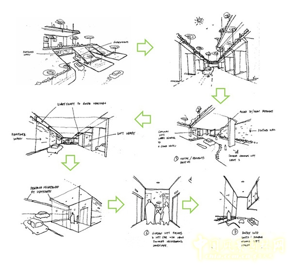 為了減少十層住宅樓所帶來的壓抑感,花園的設計使用了大型的波紋板并擴大了建筑周邊框架,其目的是通過打造公共景觀來減少高密度的城市居住方式所帶來的壓力。