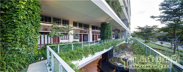 花園的設計將硬景觀與軟景觀巧妙結合,每隔兩層打造一塊延伸的平臺,花園則設置于平臺上,景觀的高度是每層樓高度的兩倍,這也就確保了每一個家住戶都能夠欣賞到花園中的美景。在景觀打造過程中的技術應用也保證了熱帶環境下植被的自然生長。