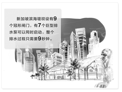 其次,加強雨水疏導,建立大型蓄水池。經由城市雨水收集系統收集到的雨水最終將匯入新加坡城市周邊的17個大型蓄水池,而這些大型蓄水池也是新加坡解決雨水疏導和城市內澇問題的關鍵所在。在新加坡17個大型蓄水池中,濱海蓄水池擁有新加坡全國最大,也是最具城市化的集水區,集水面積達1萬公頃,相當于新加坡國土面積的六分之一。濱海蓄水池由長350米的濱海堤壩與海水相隔而成。濱海堤壩設有9個冠形閘門。當大量雨水至蓄水池內水位較高而海水處于低潮時,閘門會降下,使過量的雨水傾瀉入海。而當蓄水池內水位較高且海水處于漲潮狀態時,亦可通過巨型排水泵將過量的雨水排入海洋。據介紹,當濱海堤壩的7個巨型排水泵同時啟動,整個排水過程只需要9秒鐘。新加坡濱海堤壩有效減緩了牛車水、駁船碼頭、惹蘭勿剎及芽籠等城市低洼地區的局部內澇現象,這一工程曾在國際環境工程比賽中獲獎。