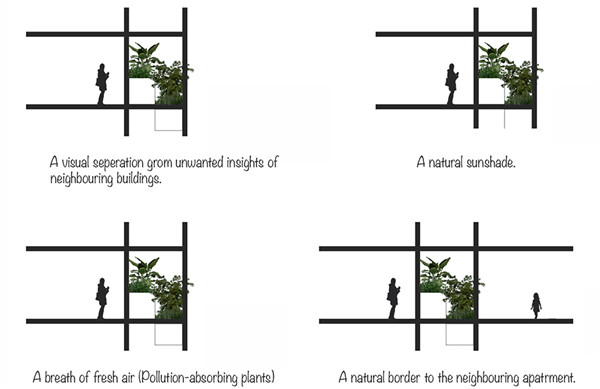 自然綠植將依附在外立面的格構(gòu)進(jìn)行生長,經(jīng)過一段時日之后,自然綠植將成為主要的面貌覆蓋于建筑表面。所以設(shè)計師也不用擔(dān)心過于凌亂的客戶選擇了,自然綠植會有機(jī)的把它們整合起來。建筑立面充當(dāng)了一個室內(nèi)與室外的中間介質(zhì),凈化空氣的自然綠植為室內(nèi)氣候提供了更好的保護(hù)與調(diào)節(jié)。灰水回收系統(tǒng)收集屋頂?shù)挠晁蜕钣盟⑦M(jìn)行二次利用來澆灌陽臺的綠植。基于印度的炎熱氣候特征,開放的公共空間為建筑創(chuàng)造了空氣自然對流,從而降低空調(diào)的使用。