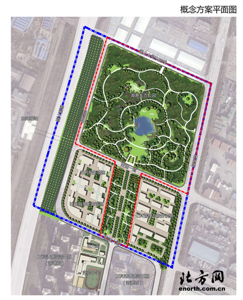 濱海新區規劃和國土資源管理局按照生態、生機、生活、紀念的主題和策略,規劃海港生態公園概念方案,藍線(如下圖海港生態公園概念方案平面圖)為規劃范圍,面積約43公頃,紅線(如下圖海港生態公園概念方案平面圖)為生態公園范圍,面積約24公頃。