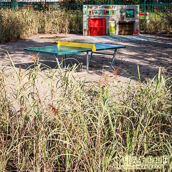 小山園中設(shè)有60-150厘米高的小山丘以及其他游樂設(shè)施,專為年齡稍大一些的兒童設(shè)計(jì)。青少年中心是一個(gè)交流聚會(huì)的場所,原有的乒乓球桌被轉(zhuǎn)移到了這里,低矮的混凝土墻裝飾一新,如同客廳一般。