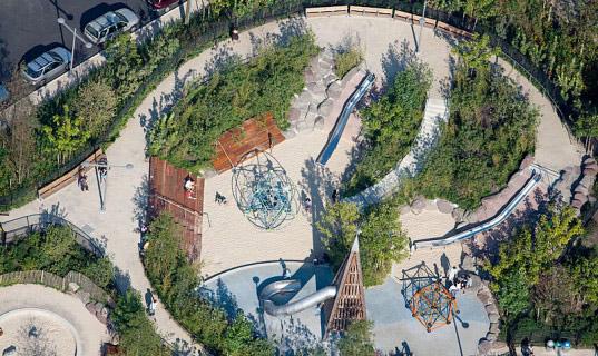 這個游樂園與我兒童時期的游樂園很相似,它是由Erect Architecture事務所建造的,特色是一系列的戶外空間、塔和攀爬結構。它位于維多利亞一個植物園的殘余物之間,所以這個公園的主題就與探索和愛護樹木有關。這些結構由回收的門、許多未加工的樹木部分以及天然卵石構成。它也包括一個菜園、果園和陡峭的高山,附近還有一個安全的篝火區。