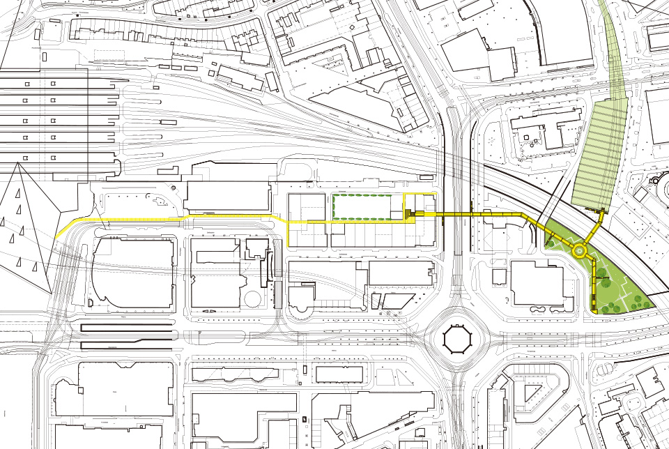 鹿特丹市中心建立起400米長的人行天橋用以連續(xù)三個核心區(qū)域—Pompenburg公園、Hofplein火車站屋頂花園、以及重要的城市商業(yè)公共空間與建筑,最終實現(xiàn)一個三維城市景觀。