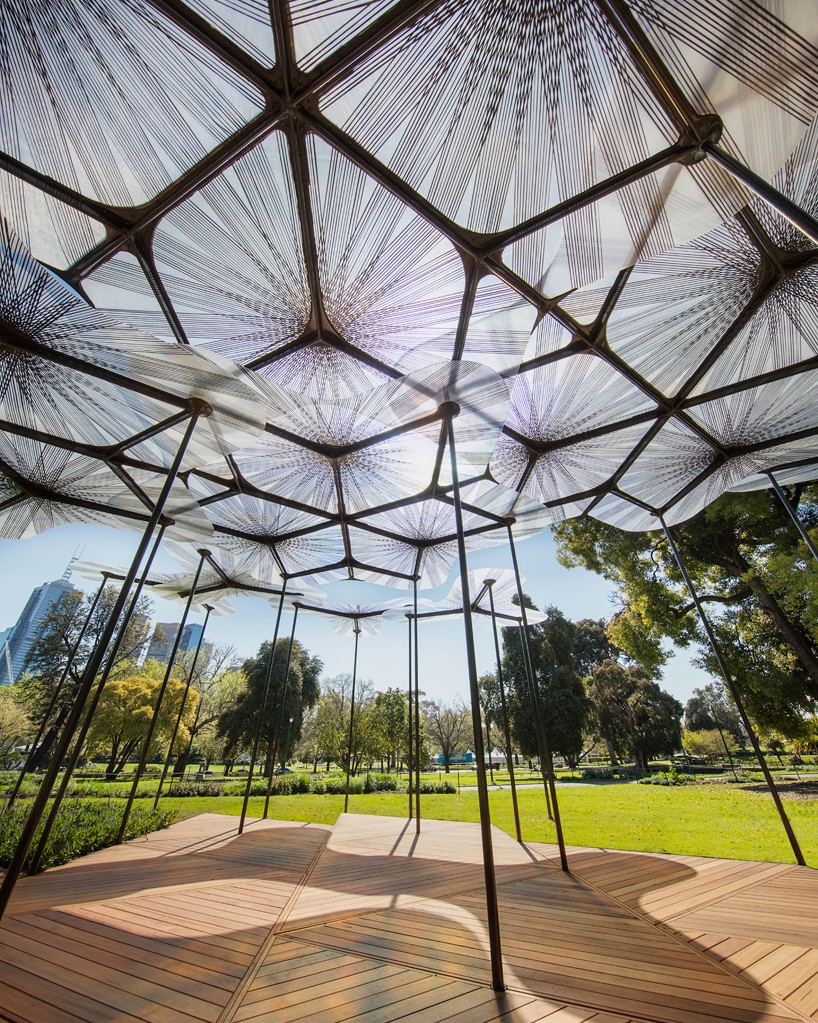 “我很高興看到2015年的MPavilion可以向公眾開放。”建筑師amanda levete如此評論道,“我們的亭子設計參照的是天然遮蔽物,這是對天然遮蔽物的一次致敬,在這里,我們有明亮的光線、開放的空間,我們可以優雅地坐在草地上,讓陽光、微風和雨水也一起成為聚會的一部分。這里可以提供私密的冥想體驗,同時也是聚會的好去處。”