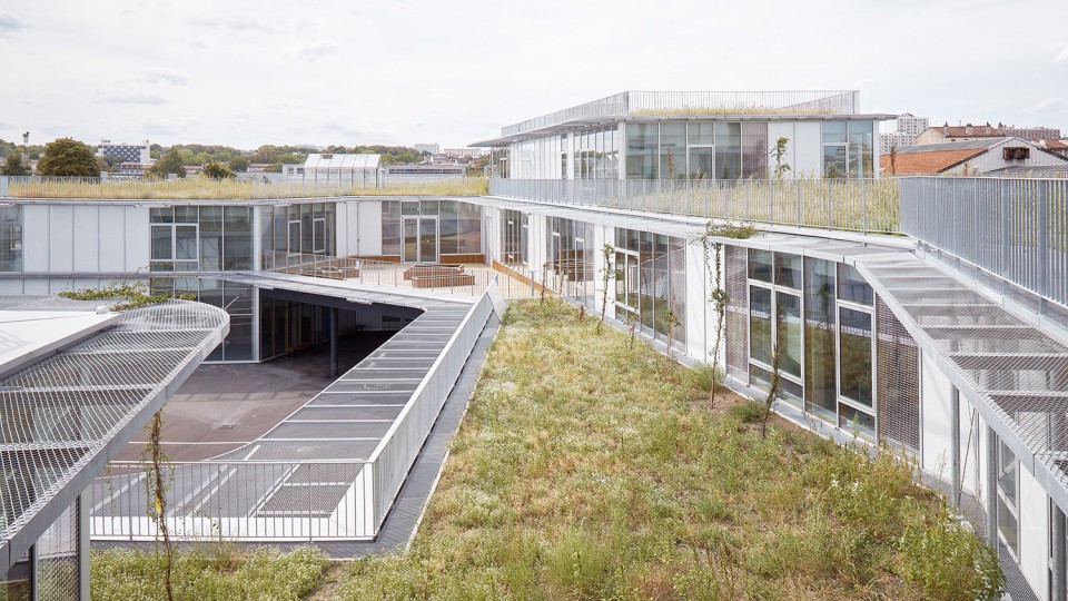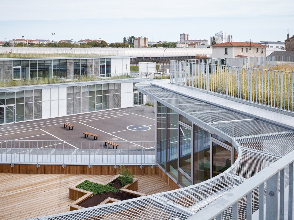 金屬遮陽篷沿著教室的輪廓布置,在室內外營造統一的空間。室外通過半開放的毗鄰林蔭道路的操場相連接。這樣的設計是為了在操場和道路及周邊寓所(有的建筑高達7層)間設計一道屏障,同時在炎熱的夏季為操場遮陰。