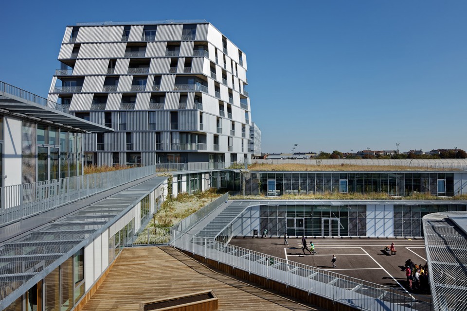 學生宿舍的設計基于4個主要建筑學原則。首先,項目作為一個整體要具有合理的功能(結構和技術空間的疊加),同時還要緊湊。距離其他功能分區的距離使它有所脫節,具有一定的獨立性。由于宿舍區被設置在盡可能北的方位,最窄的立面朝向Jean-Jaurès大街,平臺不會阻擋陽光進入室內。這也保證了操場能夠享受足夠多的陽光。