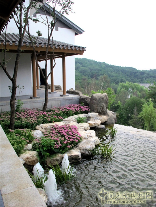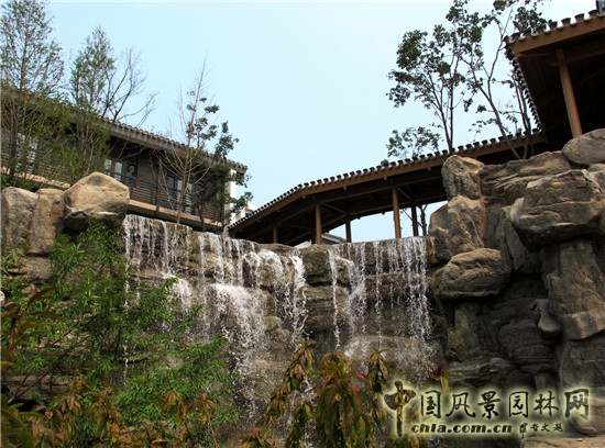 山莊服務建筑與別墅間有7-8米的落差,設計利用高差變化,以中式建筑為景觀基底,結合現狀大樹和新植庭院樹為景觀環境,加入水的瀑布、跌水、溪流等表現形式,配合點綴布置的自然山石和人造山石,形成一幅幅生動活潑、生機盎然、韻味橫生、詩情畫意的山水畫卷。水景元素的運用,呼應了云水山莊對“水”文化的追求。為山莊景色增添了靈性。
