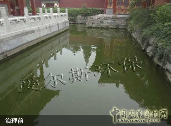 項目面積為1260㎡,四面環水,有橋可通。景觀水體渾濁、發綠、伴有藍綠藻爆發,水體表面漂有青苔、黑苔,水體景觀效果很差,水質為劣五類水。通過愛爾斯水域生態構建技術系統治理后,從根本上解決景觀水體的富營養化問題,水質達到地表Ⅲ類水標準。