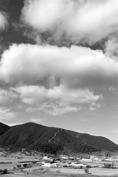香格里拉市建塘鎮郊外的森林和村莊(5月7日攝)。