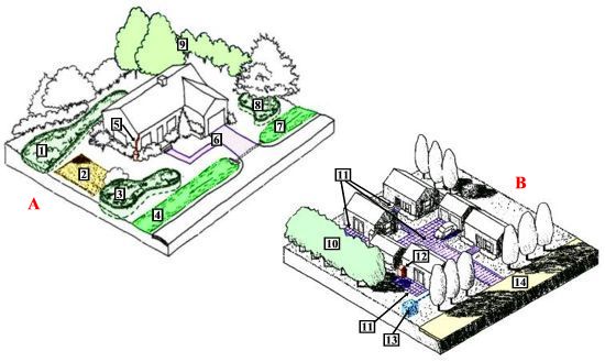 B 10. 密林保護區;11. 可滲水鋪裝;12、13. 雨水收集器(常用于高密度住宅區)14. 道路交通的處理手法