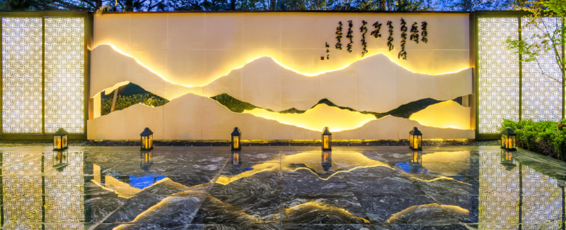此次天瑯園林的打造,是汲取了乾隆花園的理念,以翠賞六法,汲取乾園八景的靈感,匠園八景,打造諸如、山水屏風等只能在書中才窺見的山水大美畫卷。無論是北京首例的巨型觀魚缸還是疊石理水等諸多園林景觀的營造,都是以生活為源心設計而來的。
