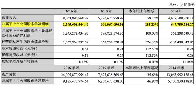 報告期內(nèi),公司實現(xiàn)營業(yè)收入85.64億元,同比上升59.16%;實現(xiàn)歸屬于上市公司股東的凈利潤12.96億元,同比上升115.23%。