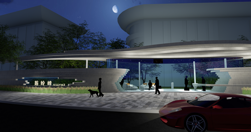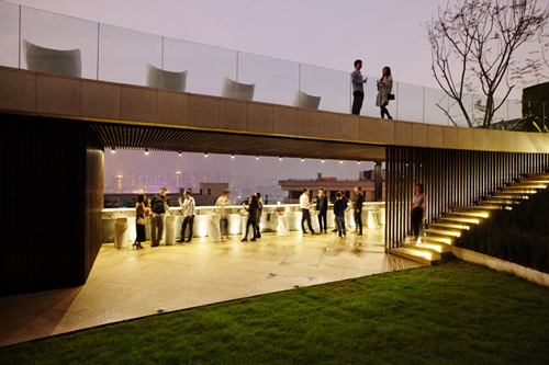 設(shè)計(jì)延續(xù)弧形建筑優(yōu)美的線條,在室外重構(gòu)了交通體系和功能空間。新的景觀功能把建筑退臺(tái)的形式延伸到室外,形成觀景平臺(tái),并且遮擋住了一些建筑設(shè)施并不美觀的細(xì)節(jié),比如風(fēng)井、采光井等等。