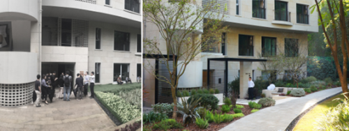 項(xiàng)目位于城市最核心、建設(shè)最密集的區(qū)域,這是對(duì)高品質(zhì)居住環(huán)境空間改造的任務(wù)。項(xiàng)目擁有俯覽城市的視野、背靠鵝嶺公園的生態(tài)綠地、著名建筑師完成的個(gè)性十足的居住建筑等等,眾多因素都成為我們?yōu)橹d奮和思考的源頭,但工作開展又困難重重。室外已建現(xiàn)狀讓優(yōu)質(zhì)資源減弱,主要表現(xiàn)在超荷載的豎向關(guān)系、模糊的交通體系、粗放的功能還有建筑與景觀的脫離。而面對(duì)困難,我們對(duì)環(huán)境進(jìn)行了“適度拆除和空間重構(gòu)”。