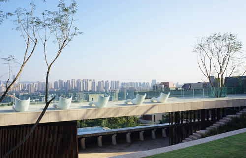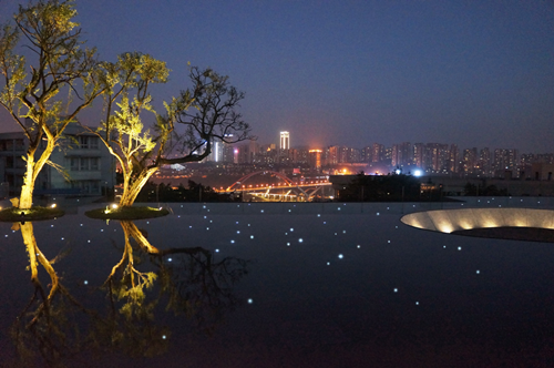 室外空間并不富余,但室外最美的景觀就是把城市的美景盡收眼里,大有一覽眾山小的氣勢(shì)。我們想把這樣的景色深刻的留在人們的感觀當(dāng)中,舒適的空間又能讓人停下腳步。我們用一條安靜的水帶勾勒了空間邊界,它又是連接不同豎向臺(tái)地的要素。水帶在視野最佳的地方匯聚開來(lái)。此刻,它就像一面鏡子,把天空、城市和環(huán)境倒影在一起。很安靜,讓人充滿想象。
