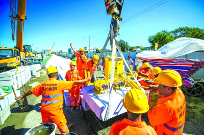 復(fù)原后的御道位于馬路中央,9米寬,其中御道中間石材采用青白石,為拱形御心石,每塊1.2米長(zhǎng)、1.4米寬,重量達(dá)1.8噸;兩側(cè)1.55米寬的斜墁條石,單個(gè)重量也達(dá)到0.8噸至0.9噸左右。每塊石板都是大塊頭,為了吊運(yùn)方便,工作人員現(xiàn)場(chǎng)動(dòng)用了8臺(tái)吊車(chē),把每一塊石板吊裝到位。