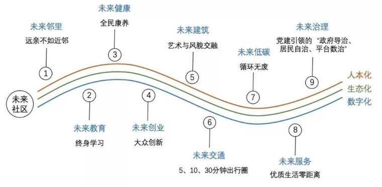 《方案》對未來社區的內涵作了明確闡釋,提出了“139”頂層設計。具體來說,就是以人民美好生活向往為中心,以人本化、生態化、數字化為價值導向,以和睦共治、綠色集約、智慧共享為基本內涵,構建未來鄰里、教育、健康、創業、建筑、交通、低碳、服務和治理九大場景,打造具有歸屬感、舒適感和未來感的新型城市功能單元。