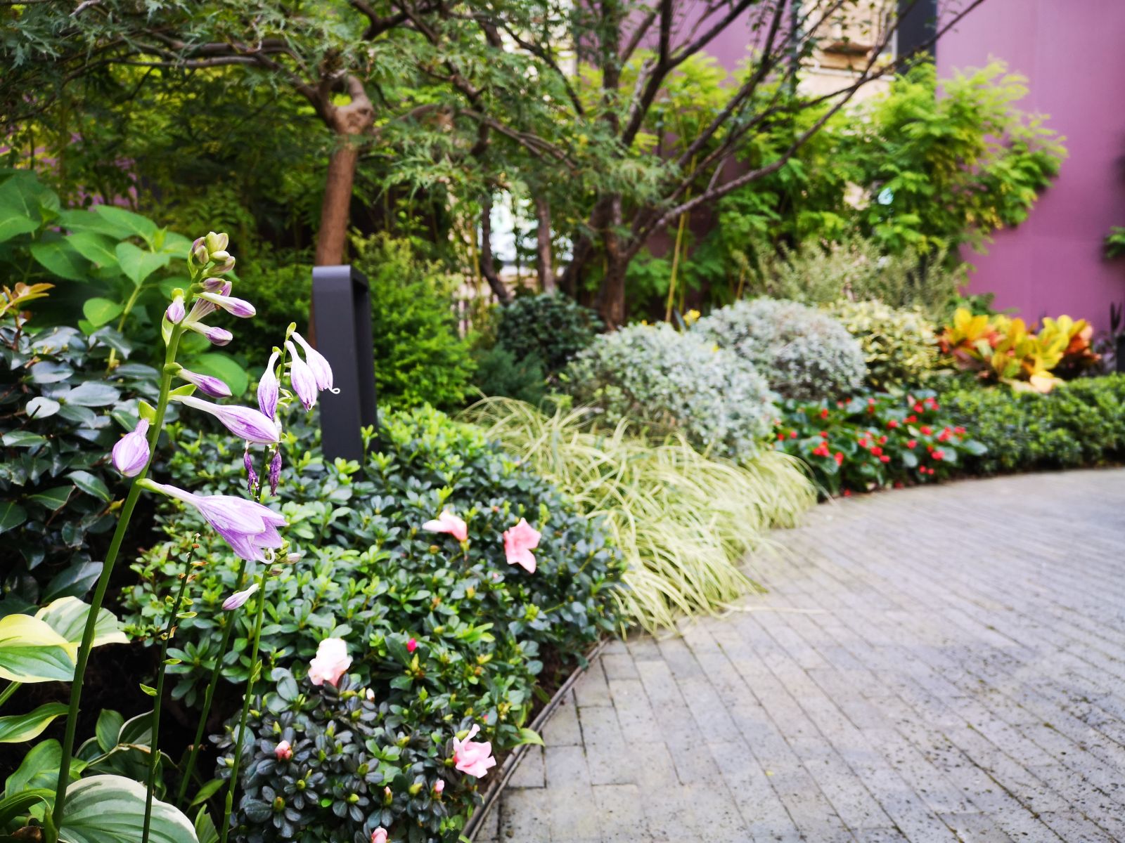 位于南京西路石門(mén)一路口的靜安區(qū)石南街心花園,利用色彩斑斕的歐洲模紋花壇式垂直綠墻和莫蘭迪色系景墻的組合設(shè)計(jì),隔離場(chǎng)地變電房等市政設(shè)施,形成豐富的空間轉(zhuǎn)換,外部是以藝術(shù)化綠墻為背景的街角空間,內(nèi)部則是淡雅精致的城市庭院。精致的小花境與特選的造型垂直梅、紅梅、紅楓、雞爪槭、羽毛楓分布在庭院內(nèi)各處,日間青枝綠葉、繁花似錦,夜晚結(jié)合庭院燈光,又是另外一番樹(shù)影婆娑、恬靜高雅的景致。