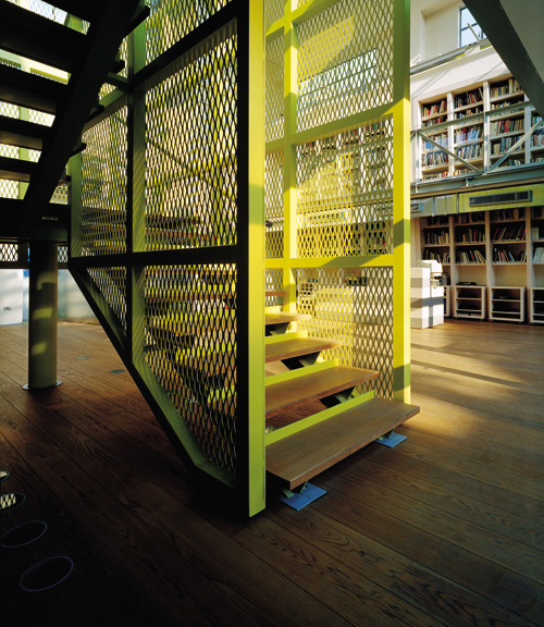 斯比克建筑設計合伙人事務所(Cibic&Partners)在建筑的內部設計了一個院子,在中層樓的環繞下,它令公共區域增色不少。院子的四周環繞著大面積的落地窗,成為吸引來訪者眼球的一大特色,并為內部空間提供了良好的光線來源。玻璃材質的引入令室內的空間感一天之內都有變化:清晨棱角分明,白天由于玻璃表面光的折射而形成空間的分隔,傍晚輪廓漸漸柔和,到了晚上,大廳空間又會有延伸的感覺。事實上,院子是文化軸心的具像化,建筑的其他區域都是圍繞這個軸心來布置的,而每一個空間在設計時,也都是從其預定的功能出發,應用不同的哲學思想來構思。