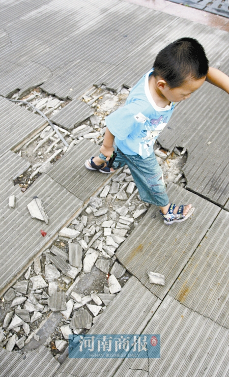 家長總擔心損壞的路面把孩子絆倒 商報記者 田仲煜/攝 有網友發帖稱,昔日景觀大道中州大道上的人行道成了“路脆脆”,早在2007年,鄭州市中州大道兩側人行道板接連出現破損、斷裂現象。記者調查發現,中州大道兩側約1公里長人行道板大坑套小洞。 ■ 現場 1公里長的人行道“千瘡百孔” “中州大道兩側的人行道板損壞了兩年,怎么沒人管?”昨日,鄭州市民李先生來電反映,稱中州大道兩側人行道板損壞嚴重,部分路面斷裂,形成若干“窟窿”,遇到下雨就積水,不少行人被“咬”。 昨日上午,記者沿中州大道從鄭汴路與中州大道交叉口向南步行至貨站街,發現機動車道西半幅約1公里長的人行道出現不同程度的破損,有些石板縫隙間已經雜草叢生。 據附近建材市場商戶劉先生稱,人行道上的石板是中州大道修路時鋪蓋的,距今已有兩三年時間。順著劉先生手指方向,路面鋪設的長方形石板已經破損一半以上,一些碎石散落在地面。從石板破損處看,人行道鋪設的石板分上下兩層,中間中空。“路面里面是空的,沒鋼筋,有重物壓過去,肯定會爛。”劉先生說。 大河網友“坐看云起時”發帖,稱中州大道為“路脆脆”。他一周前去鄭州世紀歡樂院途經中州大道,見一個小孩被人行道破損路面絆倒,于是有感而發帖。 ■ 疑問 是路太“脆弱”,還是車太“沉重” 網友“請相信我一次”跟帖說,他一年前就知道中州大道有部分人行道破損嚴重,但沒見有人修過。“那里建了那么多建材市場,拉貨的三輪車從人行道上過往,路不壞才怪呢! 在建材城附近開三輪車的牛師傅說,路面之所以出現破損,主要原因是進出建材市場的大車碾軋所致。 對于牛師傅的說法,一些司機并不認同。貨車司機李師傅稱,他們很少把車開到人行道上,路面損壞主要是大量拉貨三輪車碾軋的結果。 到底誰軋壞了人行道板,建材城商戶吳先生認為,貨車、拉貨三輪、載人三輪都有一點責任,但最主要的責任在于道路施工方和規劃部門!斑@里有建材市場,使用‘空心石板’做建筑材料合適嗎?”吳先生說。 ■ 追蹤 說起實質問題,相關部門“踢起皮球” 昨天下午,記者聯系上了中州大道改造指揮部。一名男性工作人員說,損壞的石板只在中州大道鋪設了小部分,大部分人行道采用的是其他石板。人行道板毀壞是施工不合格還是道板質量太差?面對記者提問,該工作人員稱,不知道具體原因。“現在這個路段已經移交給鄭州市環城快速路管理處! 隨后,記者致電鄭州市環城快速路管理處,一位女工作人員說,他們只負責中州大道快車道與慢車道,人行道沒有移交,并提供了中州大道綜合指揮處的電話,讓記者詢問。記者再次致電中州大道改造指揮部,一男工作人員告訴記者,對于環快的說法自己并不清楚,需要請示領導!碍h快是在推卸責任!痹摴ぷ魅藛T表示。
