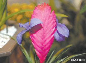 別名:紫花鳳梨 科屬:鳳梨科、鐵蘭屬 特征特性: 為著名的觀花植物,葉濃綠色,質硬,革質,基部呈紫褐色條狀斑紋。花由粉紅色近淡紫色的苞片對生組成。小花由苞片內開出,濃紫紅色。觀賞期長達70—80天。適宜在明亮的漫射光下生長,怕陽光直射。喜溫熱氣候,生長適溫為20—32攝氏度,冬季為18—20攝氏度。 優點: 因其屬氣生植物,沒有根,可從空氣中吸收必要的水分和營養,所以完全不需要種植,隨便掛在什么地方就可以了。 缺點: 在野生地,本種常纏繞在電線上,易引起火災。當地人常大量采集,用作包裝襯墊材料。 生長習性: 喜溫熱和空氣濕度較高的環境,宜光線充足,土壤要求疏松、排水好的腐葉土或泥炭土,冬季溫度不低于10℃。 繁殖: 常以分株繁殖。春季花后進行分株,切下母株長出帶根的子株,可直接盆栽,放半陰處養護。一般2-3年分株1次。也可用播種繁殖,5-6月播種,播種后15-20天發芽,播種苗3年開花。 栽培: 在生長期需用噴淋法澆水,保持盆土中等濕潤。每半月施肥1次,夏季高溫季節適當遮陰,避免陽光直射。冬季保持盆土濕潤,給予充足陽光,盡量減少澆水。 病蟲害: 容易受紅蜘蛛和介殼蟲危害,可用40%樂果乳油1500倍液噴殺。 日常養護: 生長季節保持盆土中等濕潤,炎熱時每日需為植株噴水2次,溫度低時要少澆水,保持盆土潮潤即可。 應用: 鐵蘭斑紋的葉片和扁平的苞,花序上著生深紫紅小花,十分誘人,是一種花、葉兩美的觀賞植物,適合家庭內裝飾性布置。 其形態奇特,飄逸瀟灑,花序艷麗,保持期長,是室內廳堂、櫥柜等處擺設的珍品,頗具時代氣息。