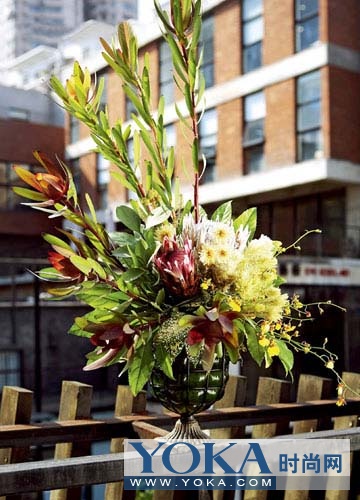 俏麗多姿的孔雀正開屏顫動,這組花藝帶給人動感的想象。