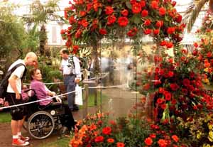 圖為一殘疾人在觀賞花卉