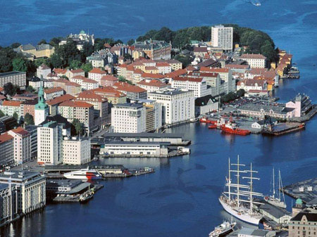 首都奧斯陸據(jù)說原意為“上帝的山谷”,又一說意為“山麓平原”。奧斯陸依偎在曲折迂回的奧斯陸峽灣旁,站在高處觀看,被大海與林海緊緊包圍,森林一望無際,看不到盡頭。