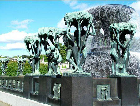 而維格蘭公園是一座雕像公園,為奧斯陸最大的弗洛格納公園中的“園中之園”。它于1924年始建,歷時(shí)19年建成,全部作品均由挪威雕塑家古斯塔夫·維格蘭創(chuàng)作,故公園以他的名字命名。這里陳列著挪威著名雕刻家古斯塔夫·維格蘭的150組雕塑,石雕主要是人物形象,男女老少栩栩如生,喜怒哀樂淋漓盡致,表現(xiàn)了人從出生至死亡的各個(gè)時(shí)期的情況,因而有人稱之為“人生旅途公園”。